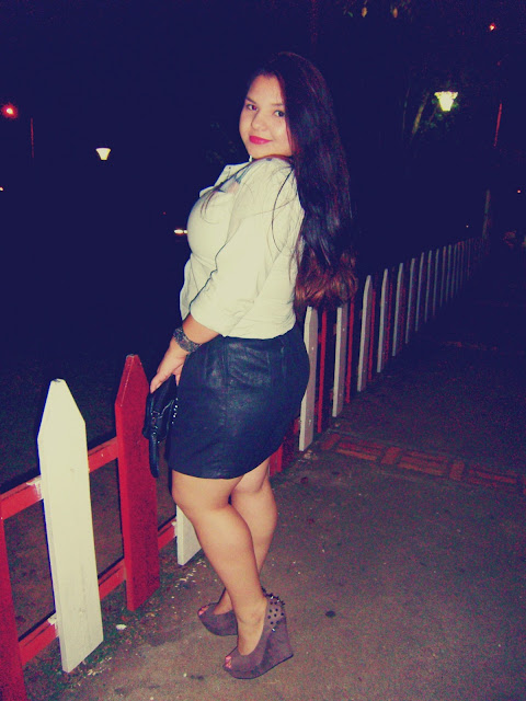 Lo que les muestro en este post es la camisa de denim que salio en un post hace algunas semanas, pero esta vez con una falda de "cuero" y unas wedges que tenia guardadas en el closet desde diciembre, y para mi son grises (aunque mi papá y mi hermano dicen que son marrones) jaja. Y obvio lo interesante de ellas son los spikes que tiene en la parte del talón. Para completar el look utilicé una carterita negra con muchas mini calaveras, se me parece más bien a un porta cosméticos o algo así, pero yo la tomé como cartera ese día y lo seguiré haciendo.